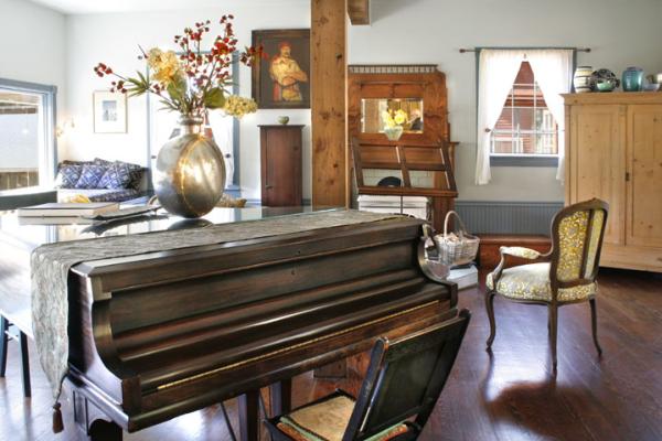 The great room has a baby grand piano, wood burning stove,